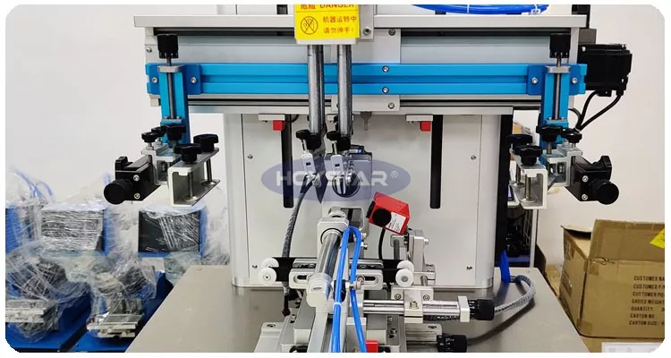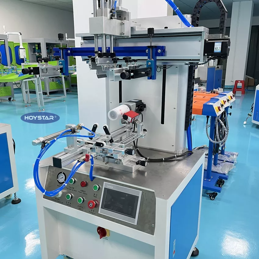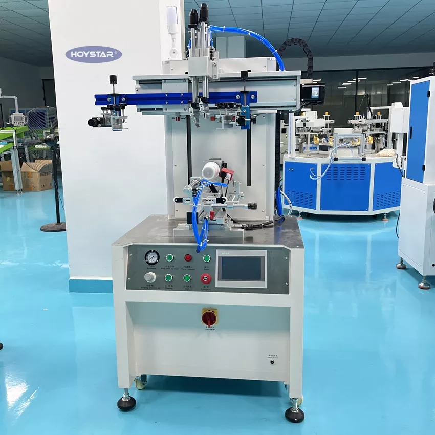 , dəyirmi səthli məhsulların çapı üçün ekran printer dizaynı. Bu maşın orta ölçülü əyri ekran printeridir, fincanlar, butulkalar, plastik borular, bankalar və s. kimi müxtəlif məhsullarda çap üçün uyğundur. O, rəng qeydiyyatını asan və yüksək dəqiqliklə yerinə yetirməyə imkan verən rəng qeydiyyatı sistemi ilə təchiz edilmişdir. Sabit keyfiyyət və aşağı səs-küylə sürətli çap edir.